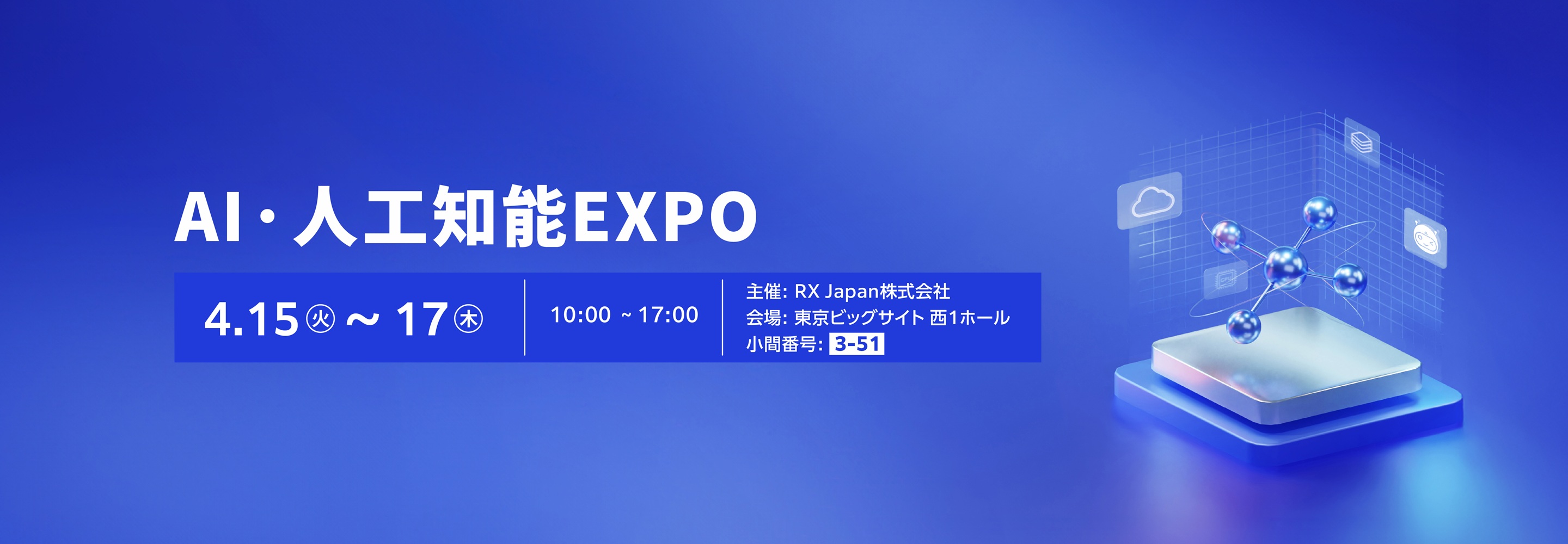 「AI・人工知能EXPO」は、製造、物流、金融、流通など、さまざまな業種に向けた最新のAI技術(生成AI、チャットボット、ディープラーニング、自然言語処理、画像認識など)が一堂に会する、日本最大級のAI専門展示会です。