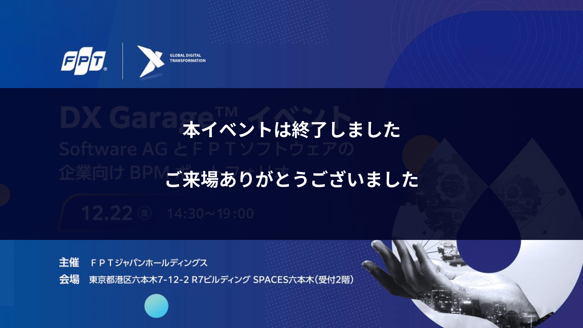 FPT DX Garage™1周年とSoftwareAGとFPTソフトウェアのパートナーシップ契約締結を記念して、皆様の交流の場となるパーティを開催いたします。また、FPTのDXケイパビリティ、FPT DX Garage™を最大限活用するための体験ワークショップも開催いたします。