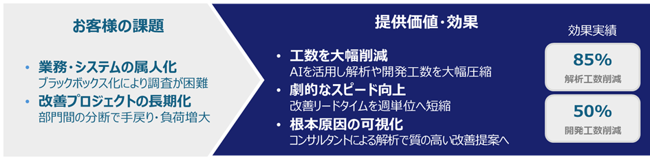 本サービスは、コンサルタントが現場に入り込み、AIを活用して現状把握(AI駆動リバースエンジニアリング)から変革を実装(AI駆動開発)までを一体で推進することで、業務とシステムの分断を解消しつつ、改善サイクルを大幅に高速化します。