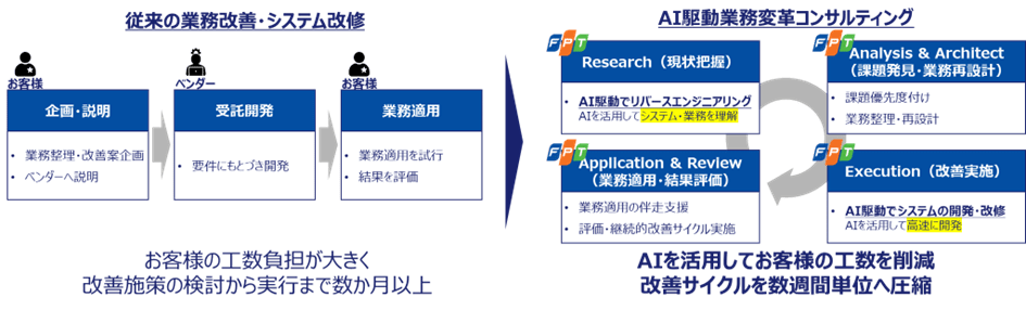 FPTはこれらの課題を解決するため、AIを活用して業務改善の構想策定からシステム実装・業務適用までを一気通貫で高速に推進する「AI駆動業務変革コンサルティング」サービスの提供を開始します。本サービスでは、業務とテクノロジーの両面を理解するコンサルタントが、現場業務の実態を把握しながら改善の企画・設計・実装・評価までを伴走して推進します。AIを活用したリバースエンジニアリングにより既存システムや業務プロセスを短期間で可視化し、課題分析・業務再設計を実施するとともに、コンサルタント自らAI駆動開発を活用することで、システム改修や機能追加を迅速に実行します。