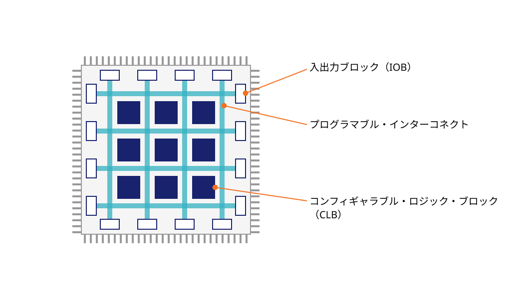 FPGAは、加法や乗法などの計算を可能にする「論理回路」を大規模化したものです。論理回路がAND素子やOR素子などの「ゲート素子」を組み合わせることで複雑な計算を実行可能にするのと同様に、FPGAには複数のゲート素子が組み合わさった小規模な「論理ブロック」が多数敷き詰められています。相互に配線・接続された論理ブロックを大量に搭載することで、複雑な計算にも対応しています。